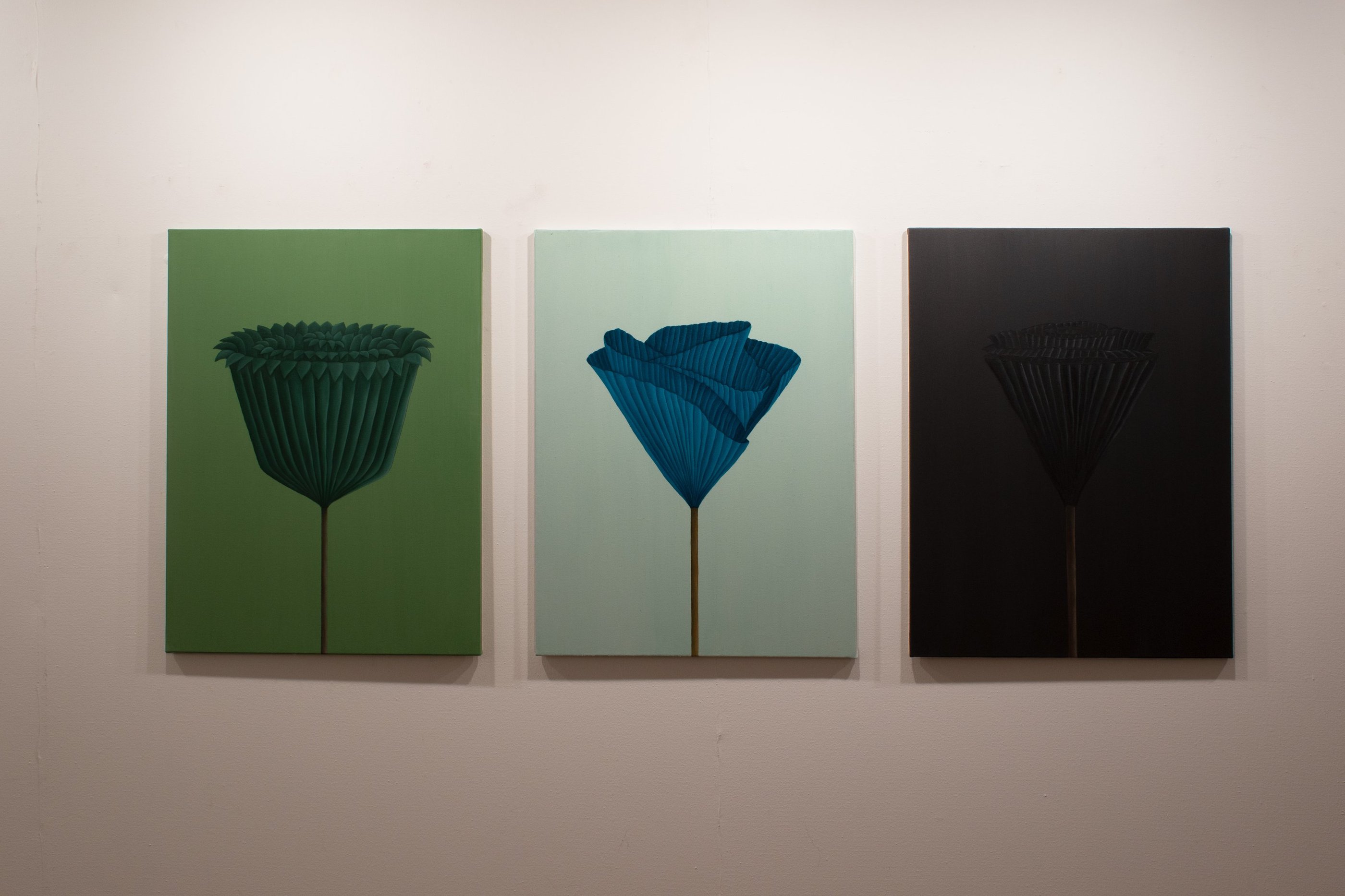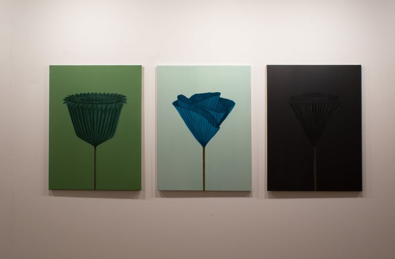 Un bambino che non ode i suoni del mondo ma che del mondo percepisce la bellezza, costruisce fiori di carta. Il bambino da adulto diventa un pittore e dipinge quei fiori di carta. Una sintesi formale sotto cui vibra il colore e il pennello. Ogni colore uno stato d’animo: il verde per coltivare la speranza, il verde foresta perché senza le foreste l’Umanità cessa di vivere, il nero per ricordare che la guerra distrugge il corpo e l’anima. Un amore per la storia dell’illustrazione e per la pittura di Domenico Gnoli e la passione per lo studio della tecnica e dei colori donano alle opere di Marco Sisto bellezza e ricchezza di significati.